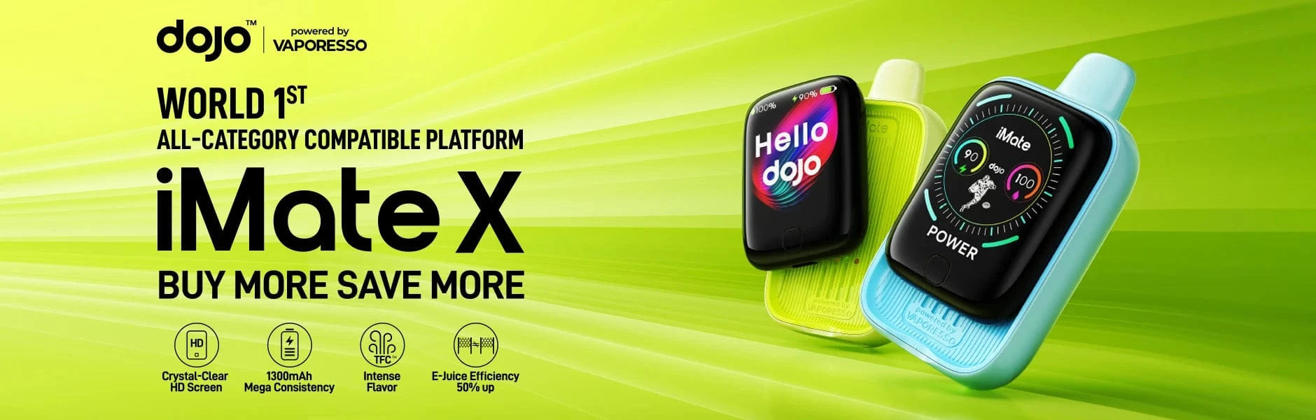 Discover the Vaporesso DOJO iMate X 20K Disposable, a game-changing vape. It has 15 ml of 50 mg/ml e-liquid for long-lasting satisfaction. It ensures extended use without power issues with a 400mAh standalone and 900mAh rechargeable battery (1300mAh total). Its magnetic sliding rail offers a great tactile feel, and the HD LCD shows e-liquid and battery levels clearly.
